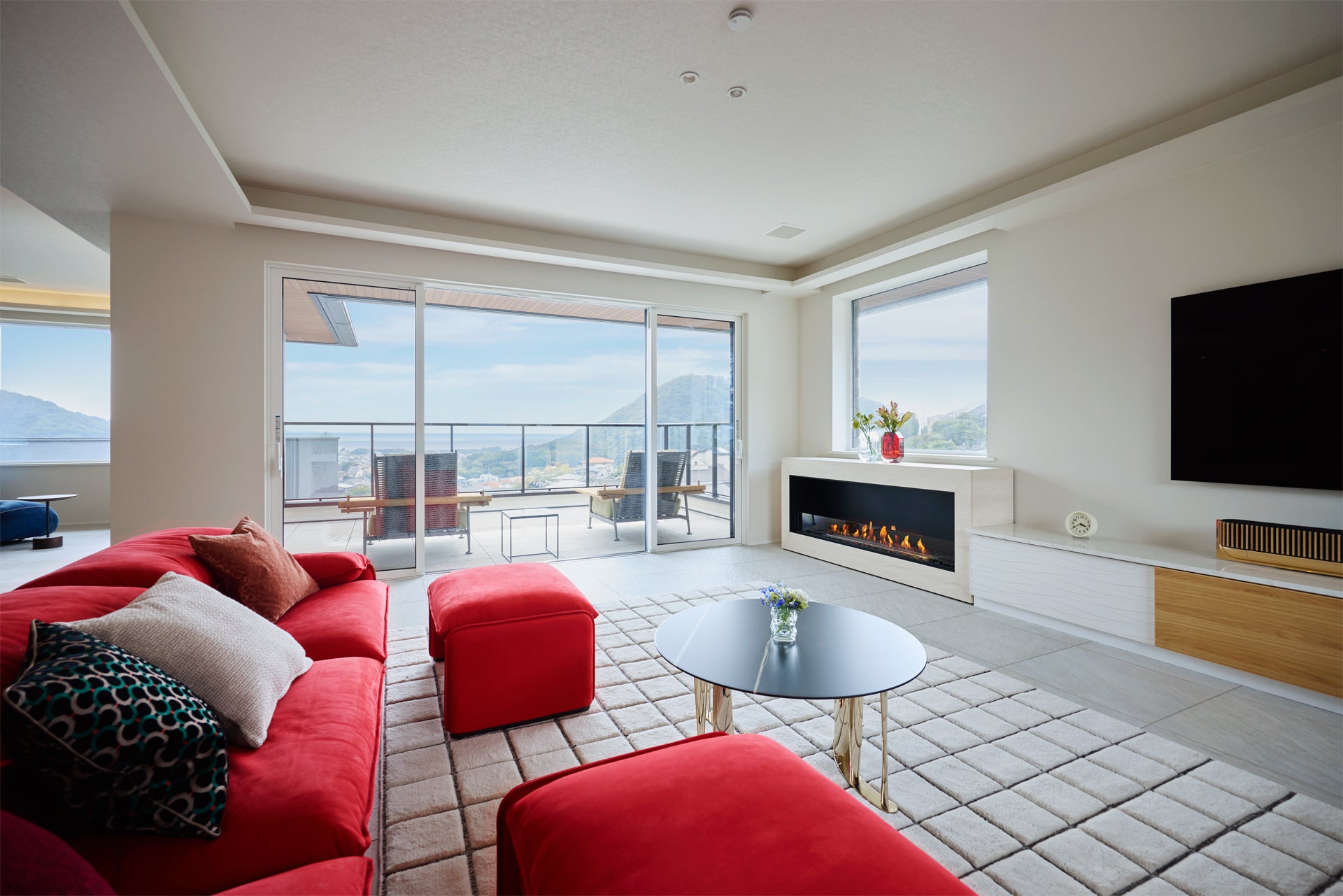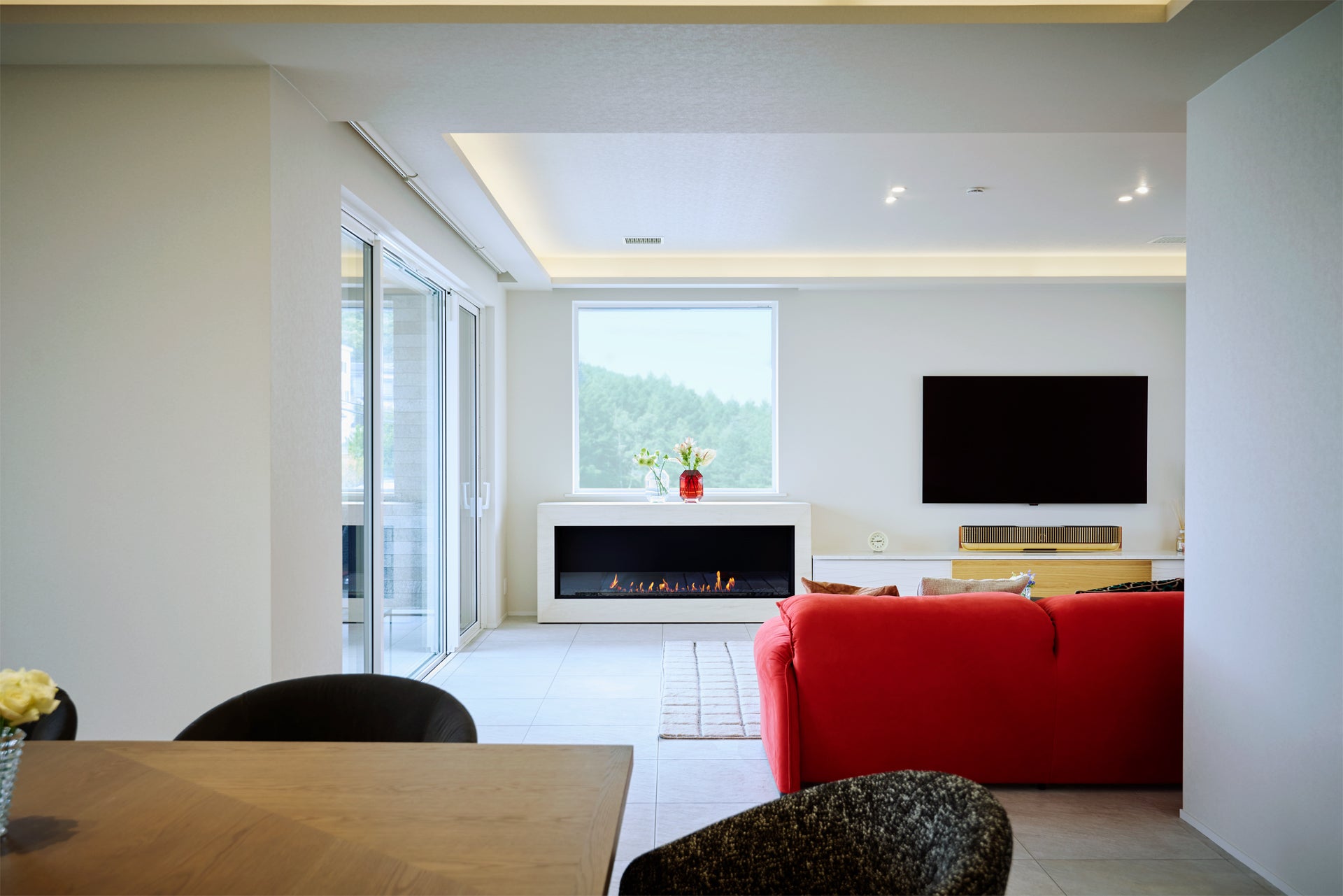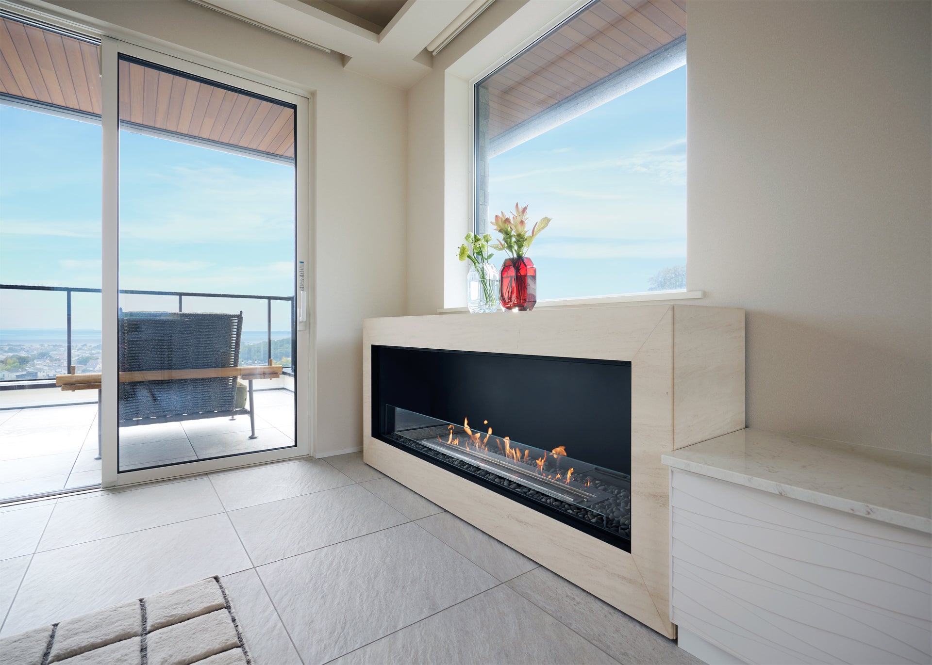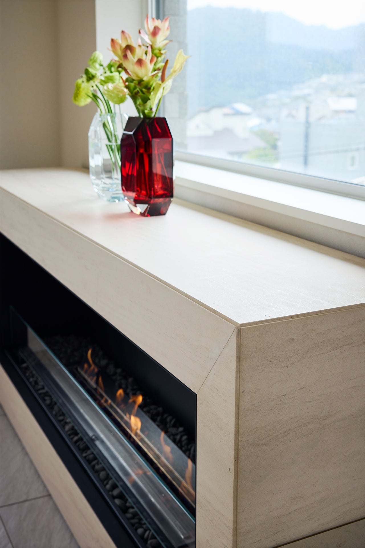 暖炉ユニットFlexシリーズから、「Flex68 SS」モデルをベースにした片面開口仕様の置き型特注暖炉。外装仕上げにSandstone(サンドストーン)を採用し、周辺インテリアとの一体感をもたらしています。