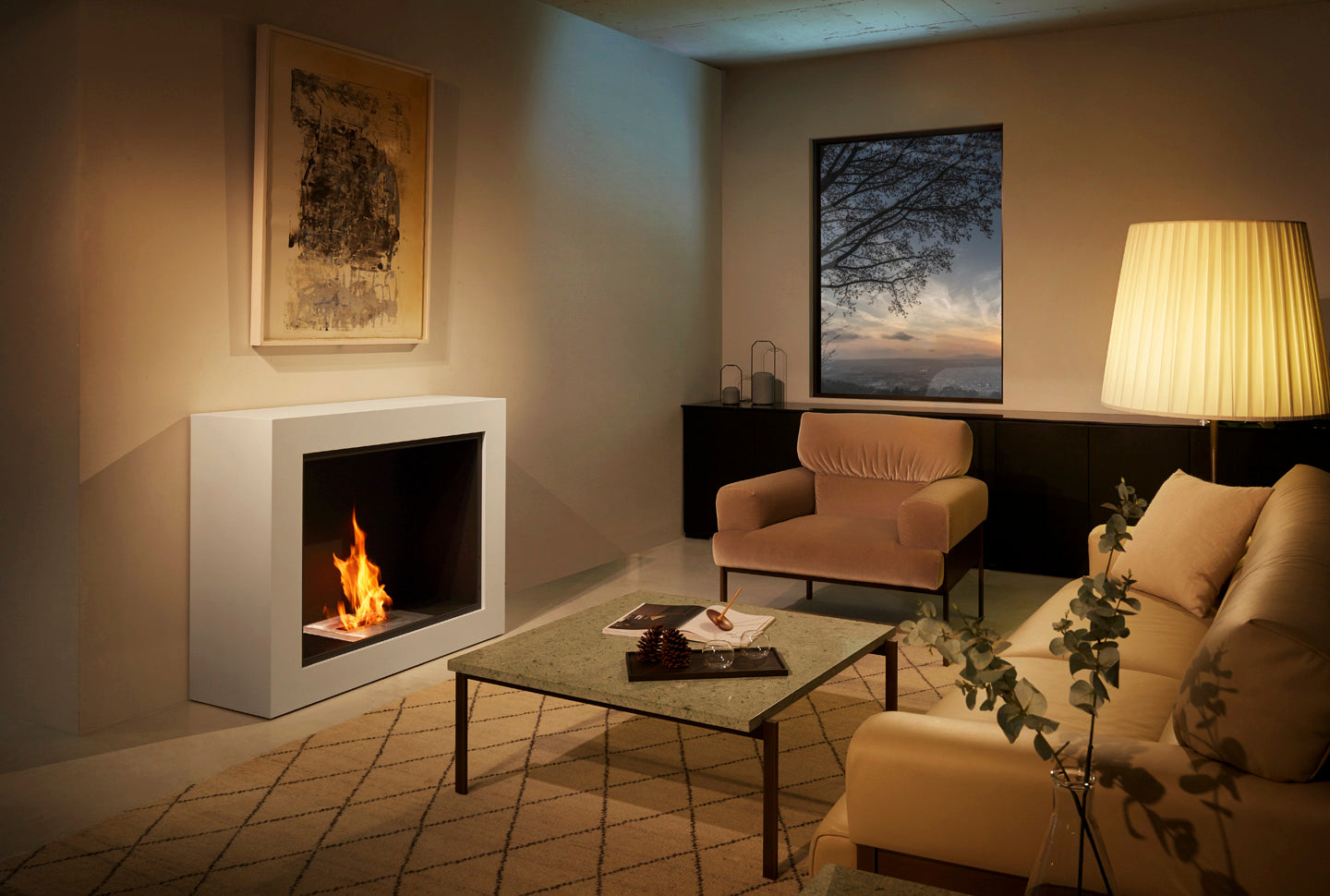 エコスマートファイヤー「Aspect」は伝統的な暖炉のデザインを取り入れつつもシンプルでモダンなデザインです。正面から見ると横長にデザインされた製品は高級感があり、どのような空間にも馴染むよう設計されています。また、奥行が39cmとコンパクトな為、住宅にも圧迫感無く設置出来ます。「BK5」バーナーが搭載されており火力調整が可能な他、25帖程の暖房能力も有しています。外側はMDF材に塗装を施しており計7色から、内側はステンレス、ブラックスチールの2色からお選びいただけます。バイオエタノール暖炉は綺麗なオレンジ色の炎を演出します。暖房能力も高く、燃焼時に発生する水蒸気により加湿効果も得られます。