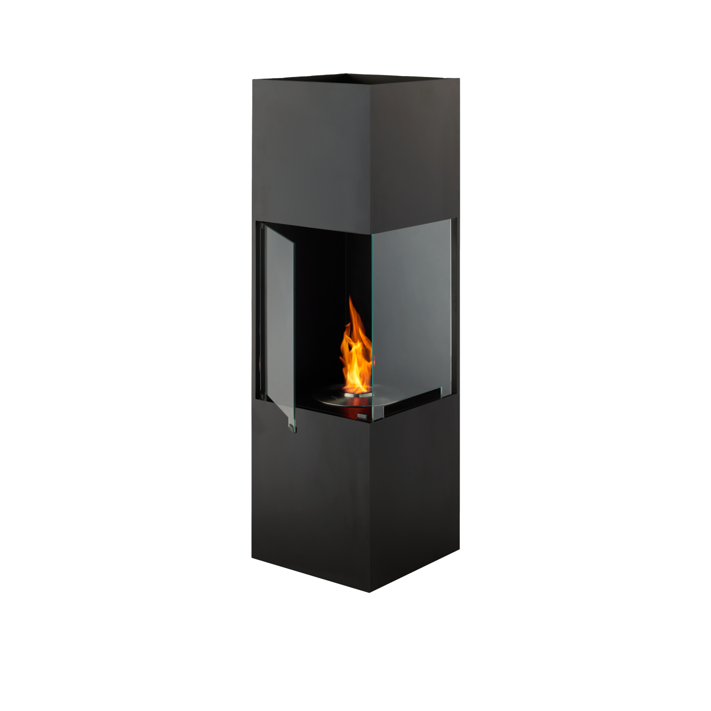 火室部分をガラスで覆い、炎が外部に露出しないデザインを初めて採用しました。 2面の開口部をガラスで覆い、半密閉状態を作っています。これにより火室内の炎に触れる心配がなく、より安心してご使用いただけます。 暖炉上部に設けた煙突状の開口により、暖気が室内に循環します。空間のコーナー部分に設置した際、どの位置からも炎が美しく見えるよう2面にガラスを設けたデザインにしています。ガラスは開閉式になっています。火室内は炎が美しく魅せるためのBlackで統一、外側はblackまたはwhiteをインテリアに合わせて選択いただけます。